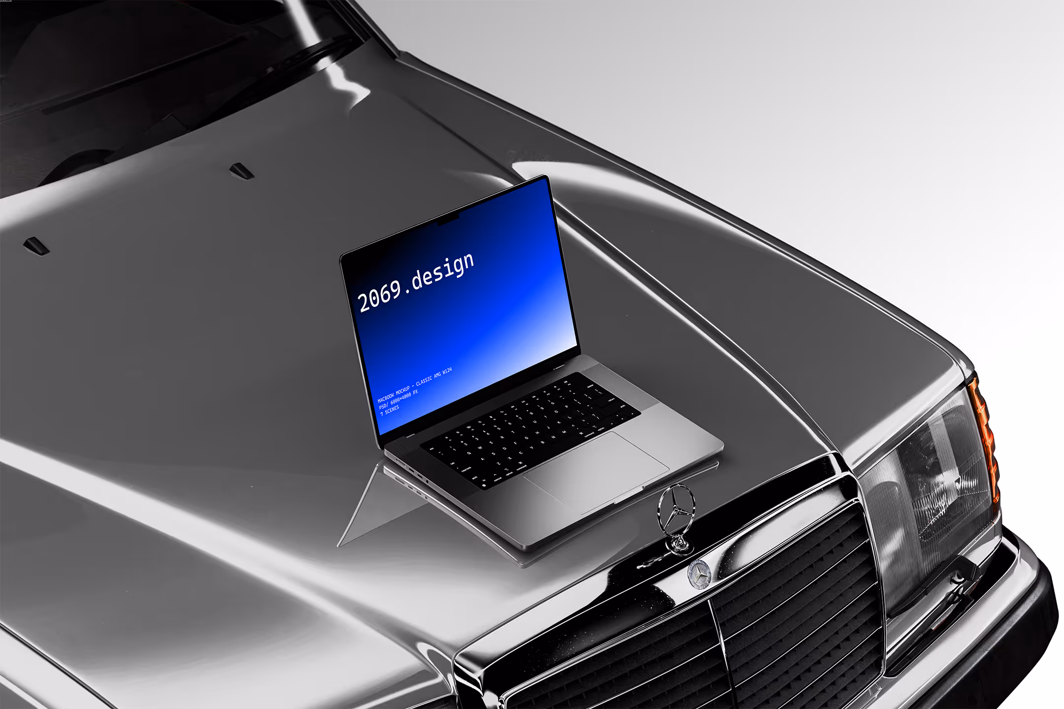 Premium 6K MacBook Mockup Pack inspired by the Mercedes W124, designed for luxury-driven UI visuals and standout branding.
